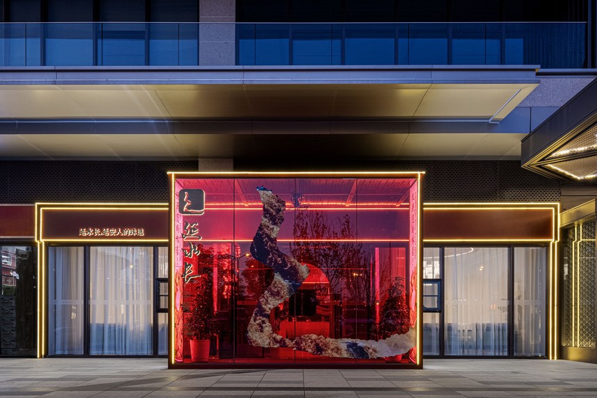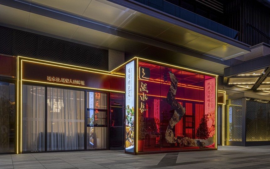 延水長餐廳項目名稱:延水長中餐廳 項目地址:延安新區中環廣場 項目面積:500平 這是一個有故事的項目。 在聽到這個項目之初, 耳邊就想起秦腔現代戲《陜北往事》中鏗鏘有力的唱腔, “延水長, 延水清, 延水點亮麻油燈。 風兒吹不滅, 雨打火更紅, 歲月輪回情不老, 丹心映得長夜明。” 黃土地,白毛巾, 金燦燦的黃小米, 紅彤彤的河灘棗, 通天響的腰鼓 和媽媽一樣的延水河, 先輩們那些熱血的事跡, 都給設計師帶來了滌蕩靈魂的創作之力。 《延水長》中餐廳項目位于延安新區中環廣場, 透過玻璃,店內景致躍然眼前。 光影下, 鋪陳的瑪莎拉酒紅, 帶著溫馨的光, 在黑夜中為我們照亮道路, 亞克力裝置中誘人的紅棗仿佛顆顆寶石, 耀眼奪目。 那個年代,那個榮耀的顏色就是我們的背景。