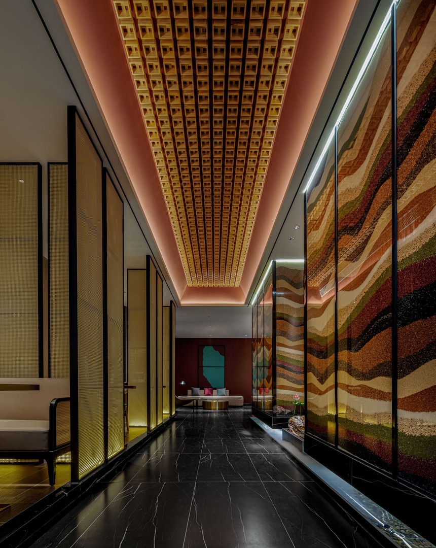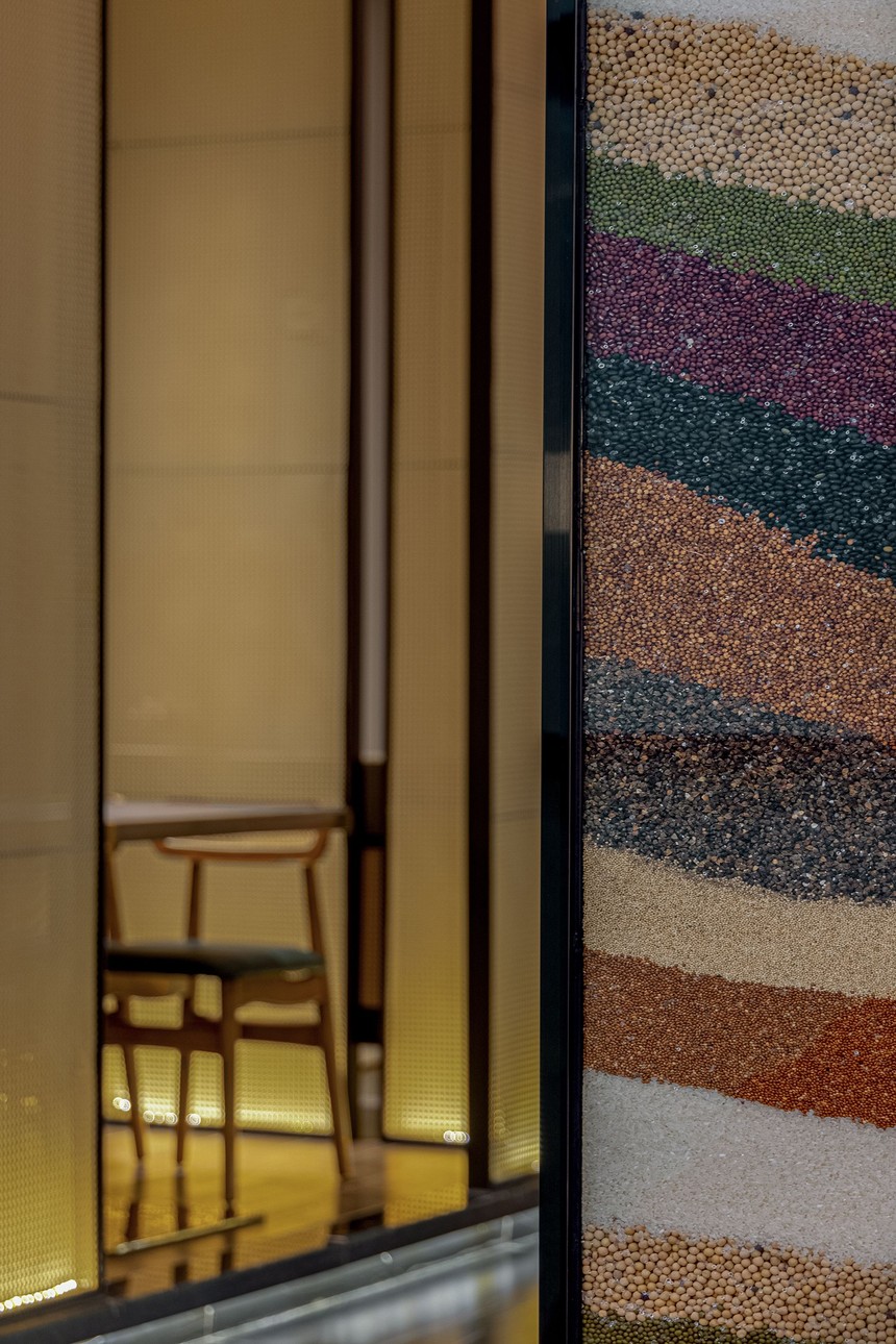 拱形的門廳, 在設計師的巧思之下, 如花蕊層層推進, 仿佛時間隧道, 高聳的窯洞下 亞克力盒中造型飽滿的大棗充盈著豐收的喜悅, 淳樸與本真, 是我們在這嘈雜的世界中苦苦追求尋的根本, 最簡單的材料確有著巨大的能量, 將我們內心的浮躁撫平。