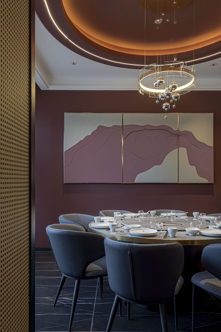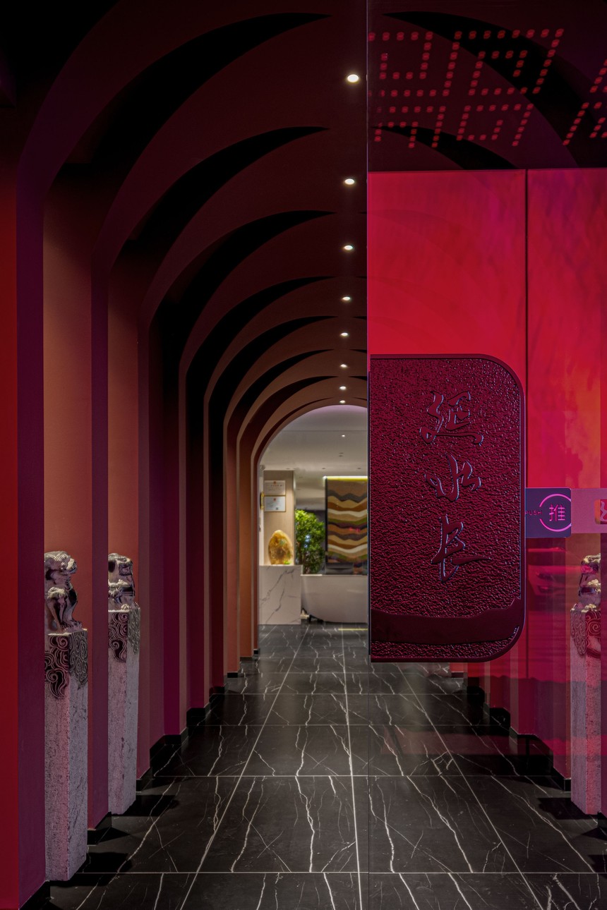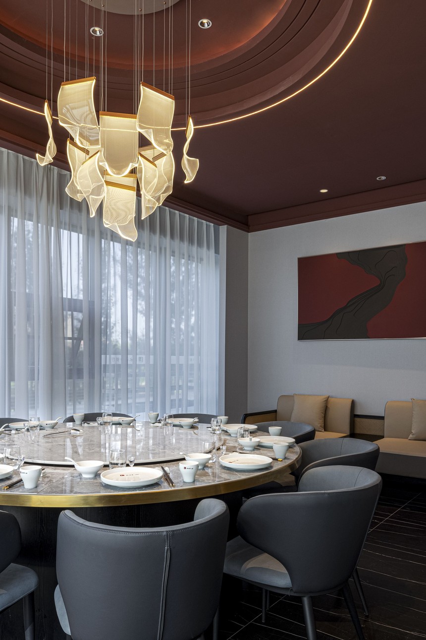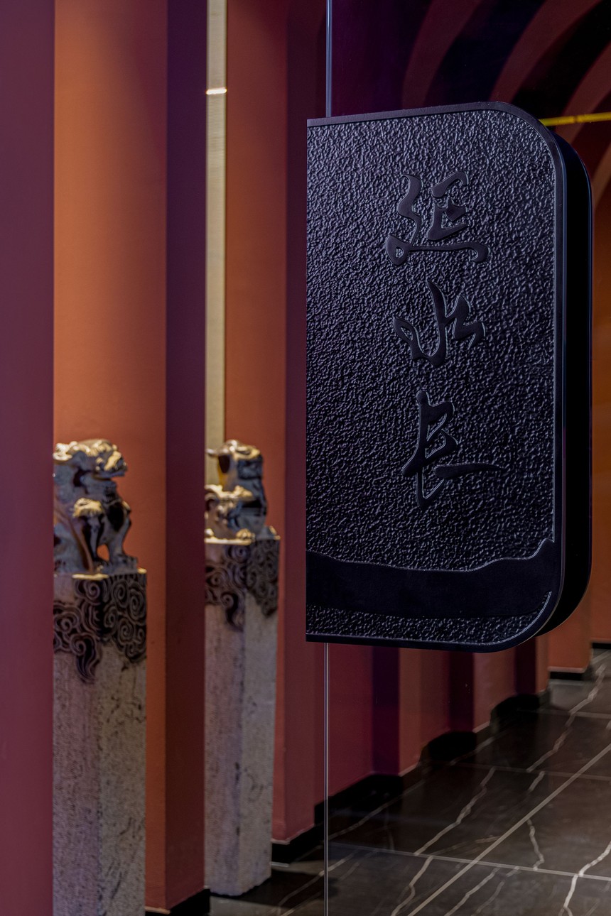包間繼續沿用了紅與黑的色系對比, 變異的弧形的讓各個包間更加靈動有活力, 設計師用現代設計手法結合當地文化元素, 一瞬間, 古樸、寧靜的美感充斥了美食之行。
