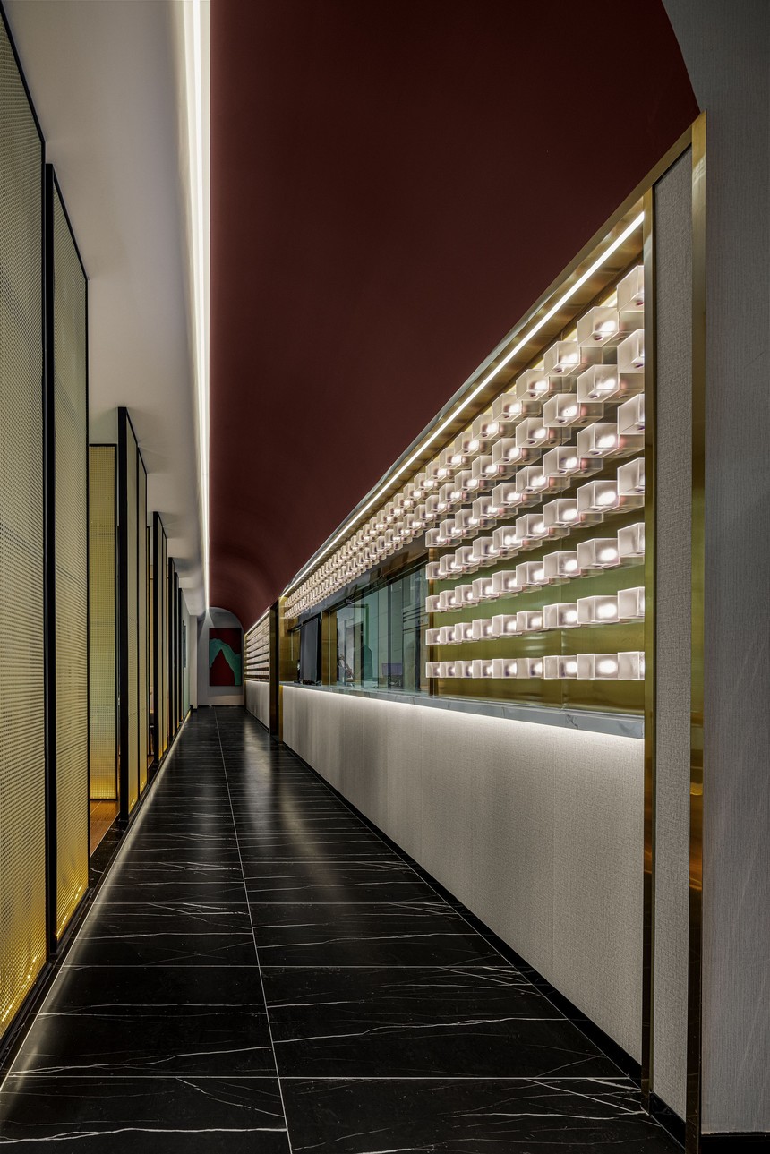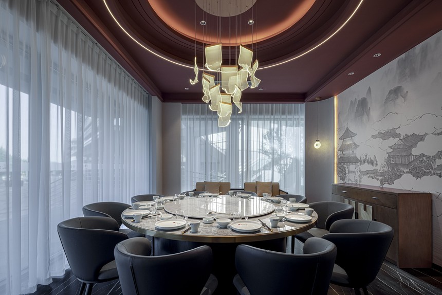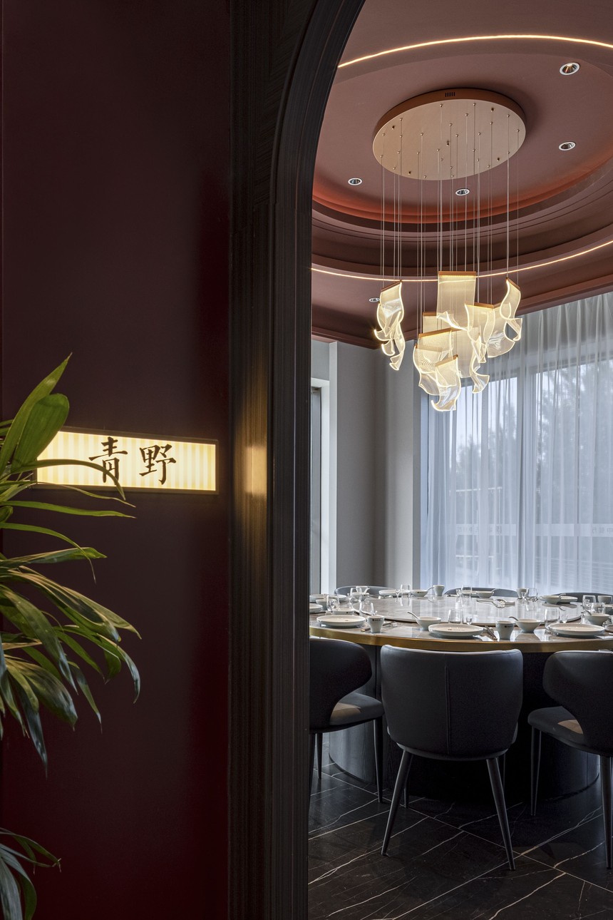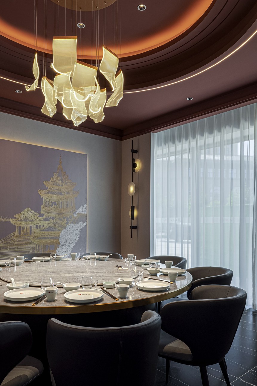 包間繼續沿用了紅與黑的色系對比, 變異的弧形的讓各個包間更加靈動有活力, 設計師用現代設計手法結合當地文化元素, 一瞬間, 古樸、寧靜的美感充斥了美食之行。