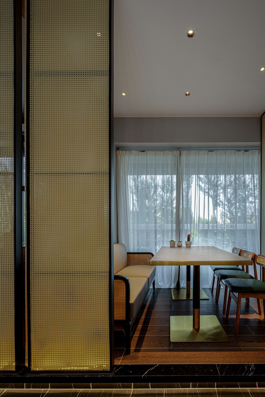 搖曳的光影漂浮在細膩的磚面之上, 深沉的黑色, 帶著不可復制魅惑, 神秘大氣。 藤編的隔檔, 簡雅疏闊。 弧與拱的穿插, 紅與黑的點綴, 大地的迎來了黎明。 眼前豁然開朗。